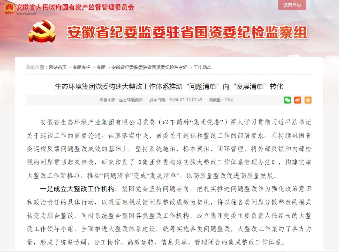近日,安徽省国资委网站-安徽省纪委监委驻省国资委纪检监督组专栏发布了《省生态环境集团党委构建大整改工作体系推动“问题清单”向“发展清单”转化》,以下为全文。