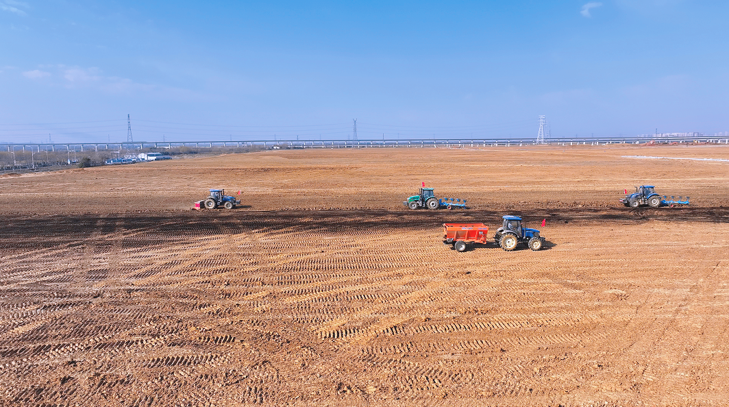 图为引江济淮工程高新区2号弃渣场临时用地土地复垦项目土壤改良作业现场