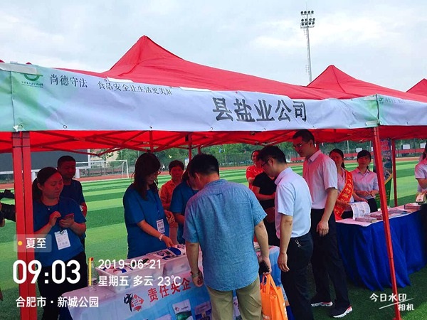 按照统一部署,6月21日早晨,长丰县盐业公司5名工作人员早早就来到了活动现场,带着《食盐专营办法》等宣传资料、品种盐样品及订制的水杯参加宣传活动。启动仪式开始后,首先由县政协副主席致辞;接着是合肥伊利乳业有限责任公司代表食品生产企业作承诺发言;最后由县人大副主任宣布“长丰县2019年食品安全宣传周暨食品安全长丰行活动正式启动”并会同场上领导共同按下仪式启动球。活动现场人群涌动,气氛热烈,长丰公司5名工作人员穿着统一T恤,佩戴着工作证,分别在两个展台开展宣传。主要宣传《食盐专营办法》、讲解多品种盐知识,推崇“吃好盐 选中盐”,吃盐首选“绿色食品盐”的健康理念。