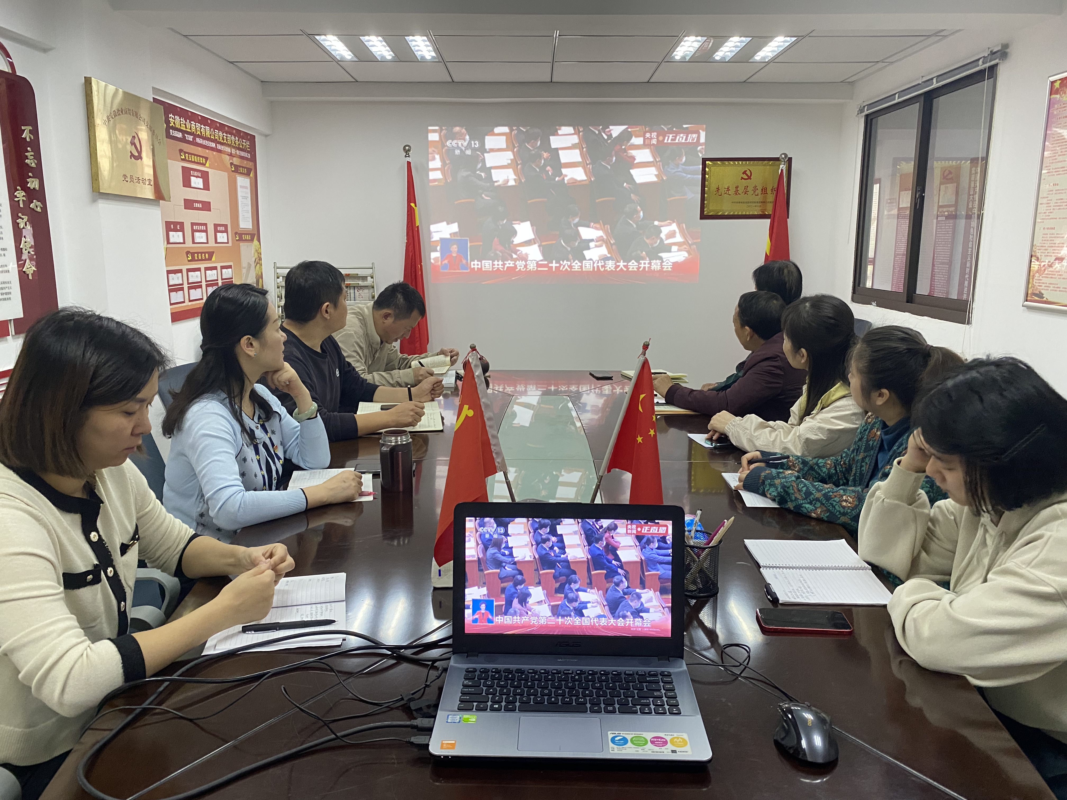 2022年10月16日上午,安盐商贸公司党支部组织全体干部职工观看党的二十大会议直播。