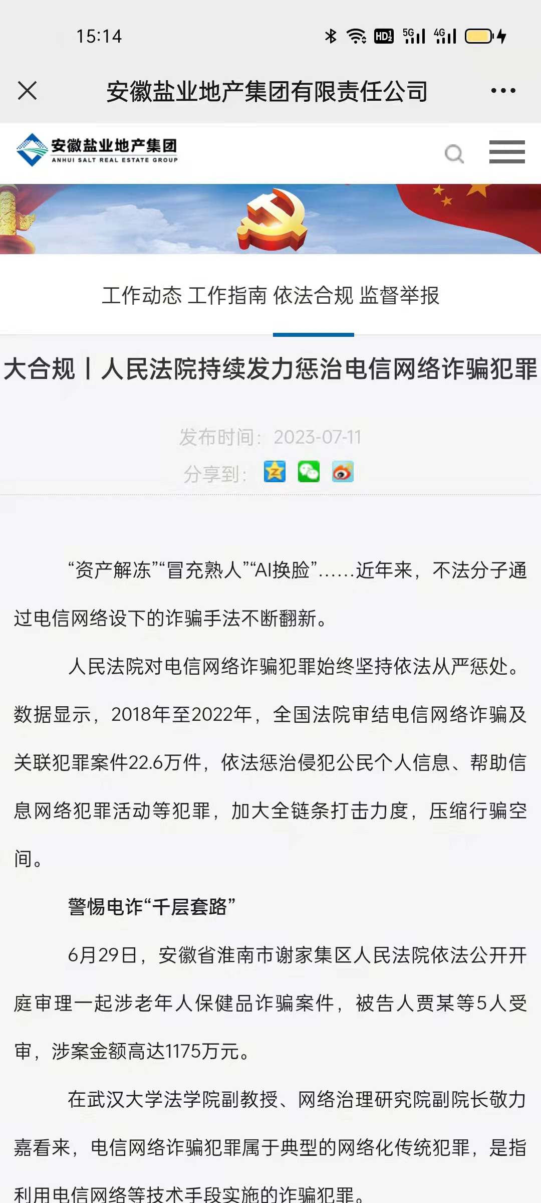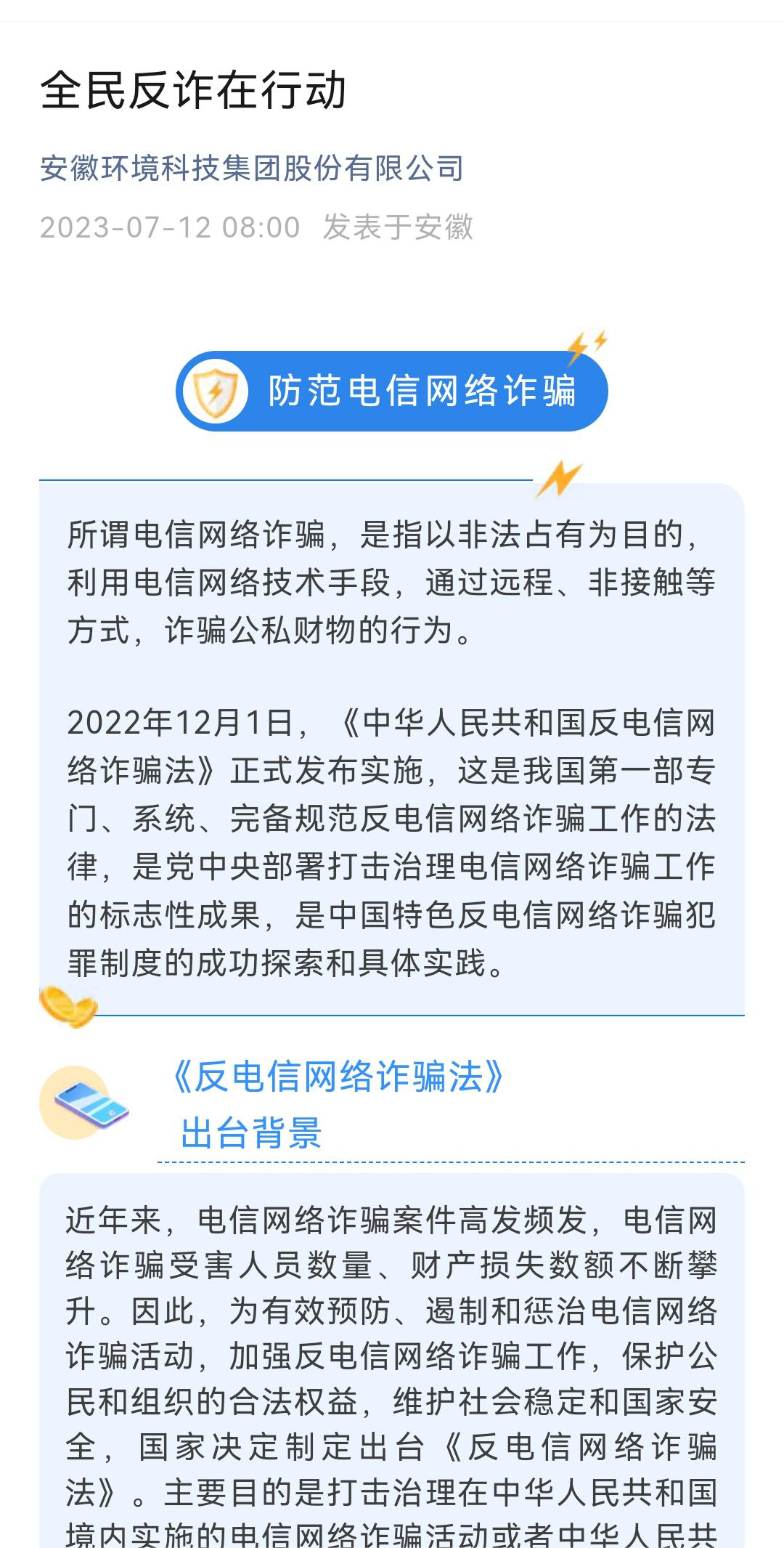 环境科技集团、省健康养老、徽盐金融等公司通过印制各类反诈宣传单、宣讲防范电信诈骗安全知识,在公众号发表普法文章等形式,号召全体员工增强防范意识。