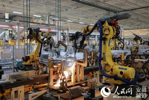 江汽集团生产线。图为机器人正在进行焊接。人民网 王晓飞摄