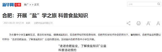 2023年7月,合肥盐业自1950年成立以来首次对外开放,面向全市中小学生,开展“盐”学之旅,食盐科普游活动,活动内容包括参观60年历史的铁路专用线、省市食盐储备仓库,食盐健康科普讲座,7月份接待来自国内外7所中小学校170名学生和家长,8月份已预约8场食盐科普游。