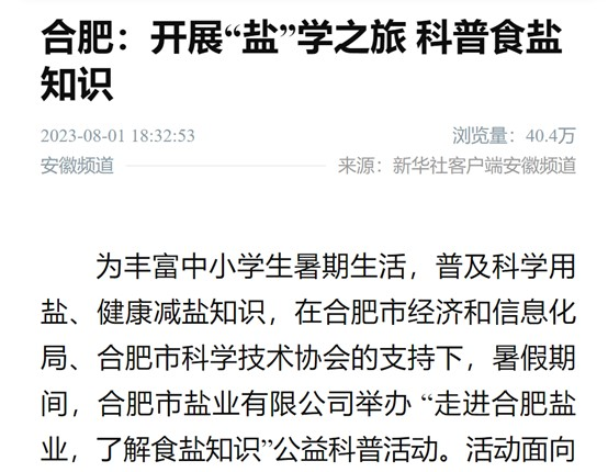随着“请进来”食盐科普游活动深入开展,得到新华社、新华网、北京科技报、安徽科技报等省级以上媒体关注和报道,其中新华社报道浏览量达40.4万人次。