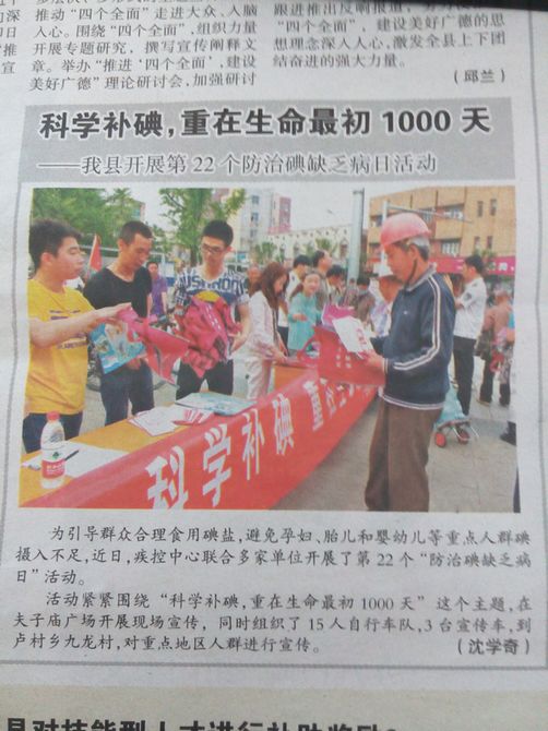 活动紧紧围绕“科学补碘,重在生命最初100天”这个主题,在夫子庙广场开展现场宣传,同时组织了15人自行车队,3台宣传车,到卢村乡九龙村,对重点地区人群进行宣传。