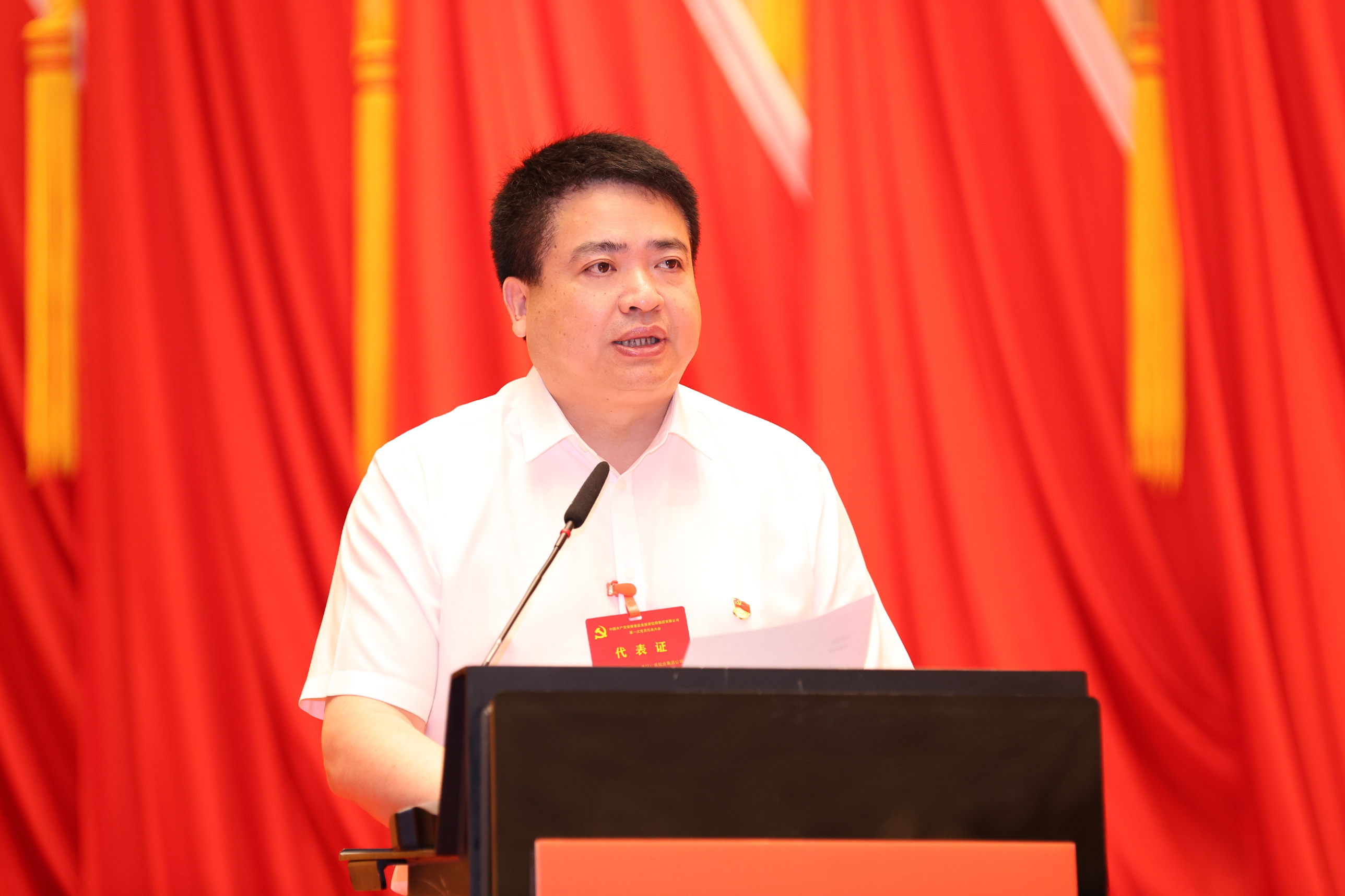 会场洋溢着庄重热烈的氛围,主席台中央金色的党徽在红旗簇拥下熠熠生辉,会场内悬挂着“全面推动战略转型 勇当绿色发展先锋 为打造长三角标杆生态环境产业集团而不懈奋斗”的巨幅标语,格外醒目。