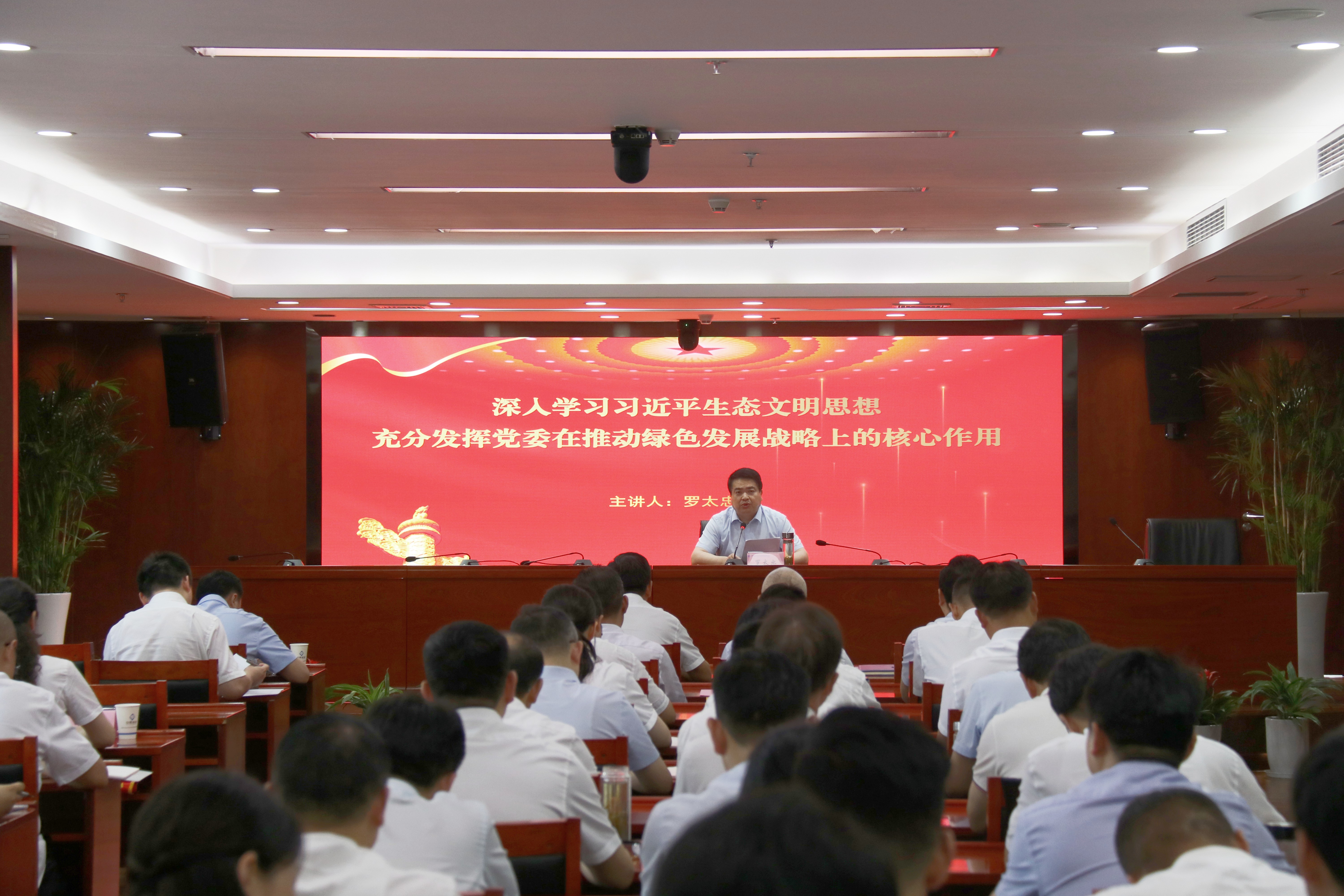 罗太忠以“深入学习习近平生态文明思想,充分发挥党委在推动绿色发展战略上的核心作用”为题作专题党课报告,从深刻理解和把握习近平新时代中国特色社会主义思想所蕴含的观点立场方法、深刻理解和把握党的二十大的战略部署和目标任务、深刻理解和把握习近平总书记关于本地区本部门本领域的重要讲话、重要指示批示精神以及集团公司未来发展的战略和路径等方面,详细阐述了习近平新时代中国特色社会主义思想理论的精髓,明确了集团公司转型生态环境产业的具体路径,进一步统一了思想、凝聚了共识。罗太忠在报告中指出,党的二十大将“生态环境保护发生历史性、转折性、全局性变化”作为新时代十年伟大变革之一,将“促进人与自然和谐共生”作为中国式现代化本质要求的重要内容。要深刻领会习近平生态文明思想和习近平总书记关于绿色发展的重要论述,充分把握贯彻落实绿色发展战略的重大意义,进一步增强推动集团公司转型生态环境产业的使命感、责任感和紧迫感。要学深悟透习近平新时代中国特色社会主义思想,更好运用贯穿其中的立场、观点、方法指导推动工作,进一步提升政治能力、思维能力、实践能力,把习近平总书记关于推进生态文明、建设美丽中国的指示精神落到实处。