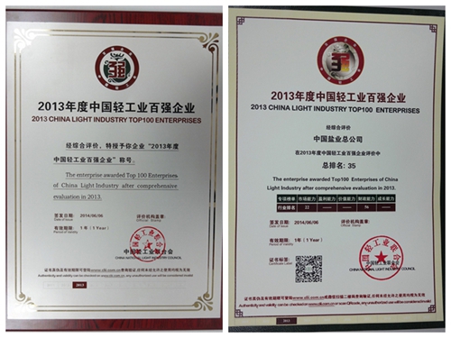 6月6日,中国轻工业联合会在北京京西宾馆举办了以“新经济、新模式、新视角”为主题的“第三届中国轻工企业家高峰论坛暨轻工百强企业颁奖盛典”。大会发布了“2013年度中国轻工业百强企业”荣誉榜单,中盐总公司荣获“2013年度中国轻工业百强企业”称号,在2013年综合百强榜单中排名35位,并获市场能力专项排名第22名。