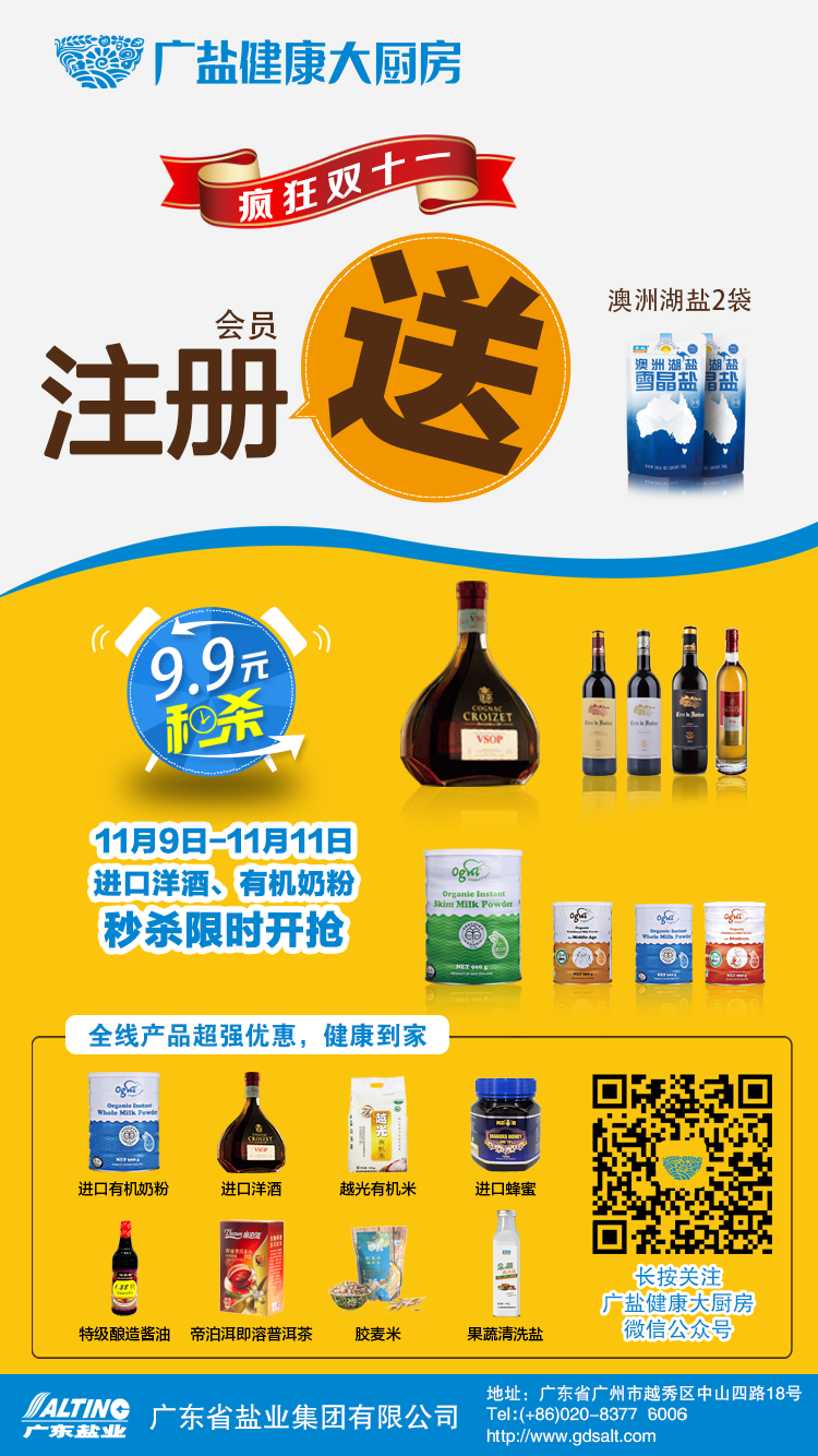 广东省盐业集团在11月组织开展全省统一的广盐健康大厨房“双11” 营销活动。活动期间,用户关注“广盐健康大厨房”微信公众号(微信号:gyjkdcf)并注册为会员的,每人均可免费获赠两包澳洲湖盐(250g),另外还有多款商品限时“9.9元秒杀”及全场打折优惠活动,活动详情及参与方式请大家关注广盐健康大厨房。