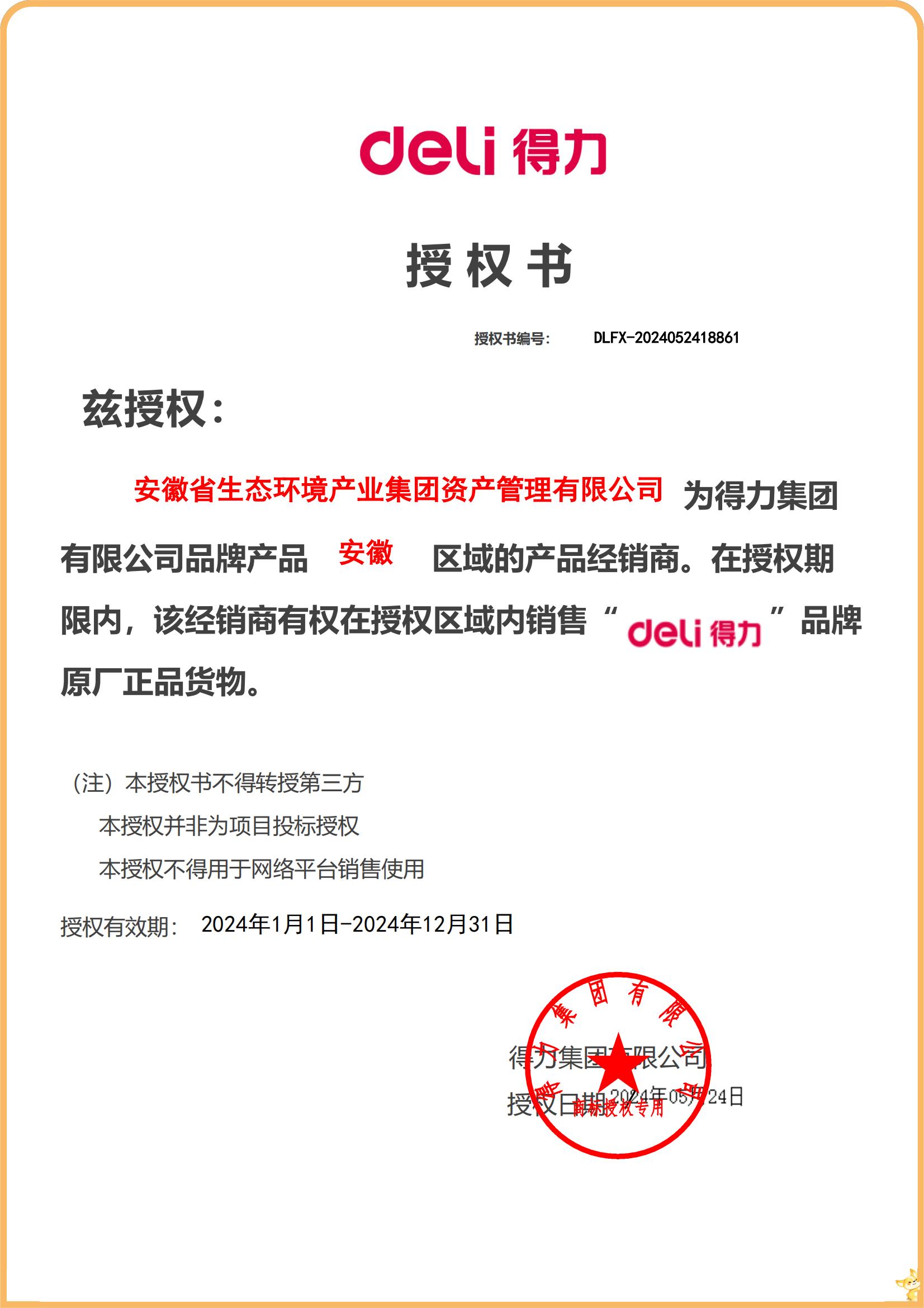 经过不懈努力,5月24日,省生态环境产业集团资产管理公司获得中国最大的办公与学习用品产业集团即得力集团的官方授权。